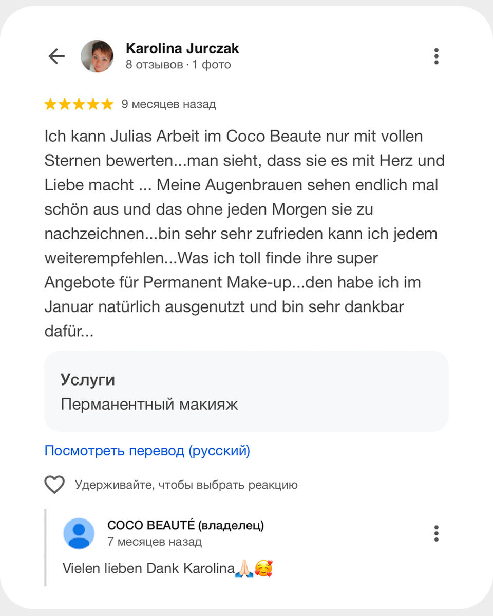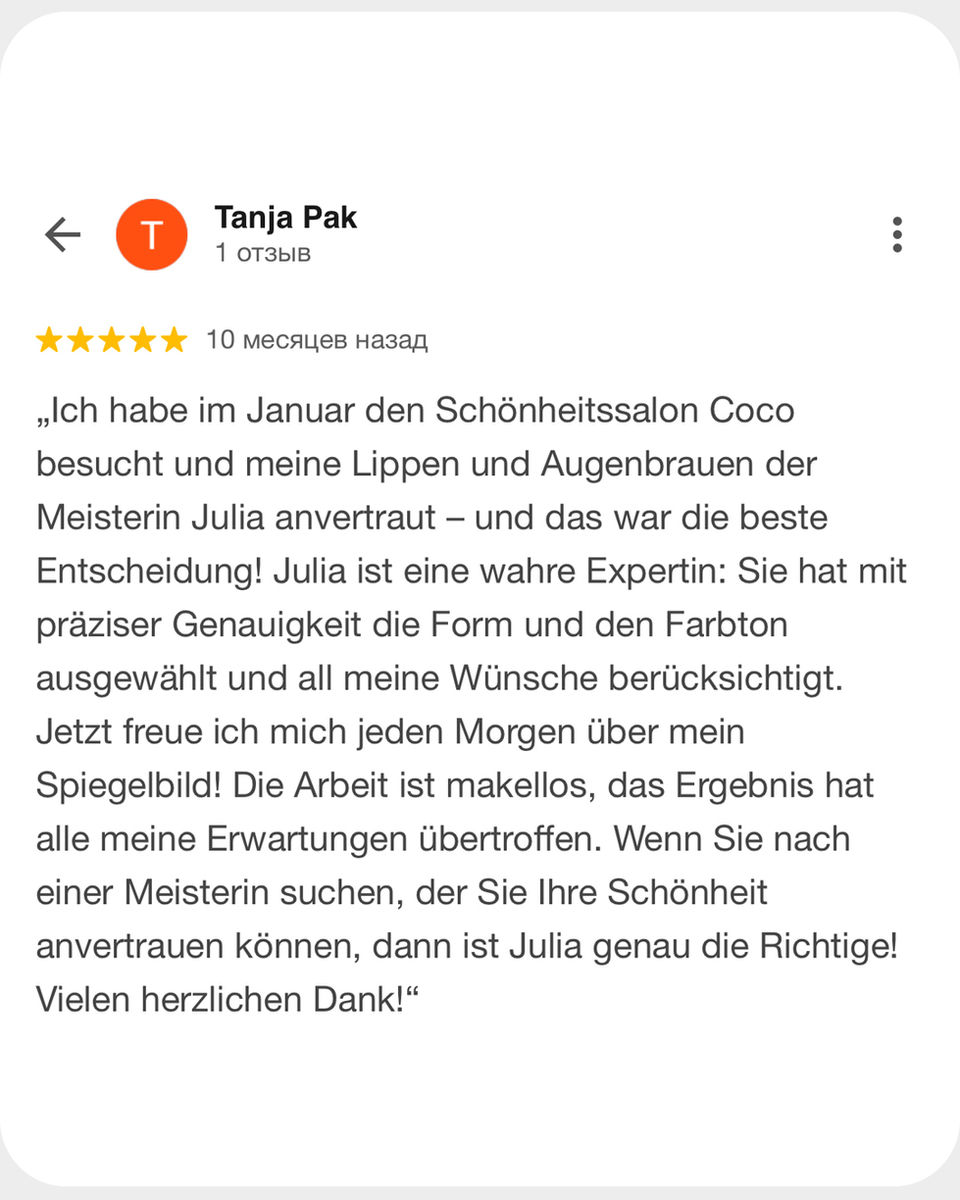 Seit mehr als 6 Jahren spezialisiere ich mich auf Permanent Make-up und arbeite mit modernen, sicheren Techniken, die Natürlichkeit, Ästhetik und Gesichtsharmonie in den Mittelpunkt stellen.